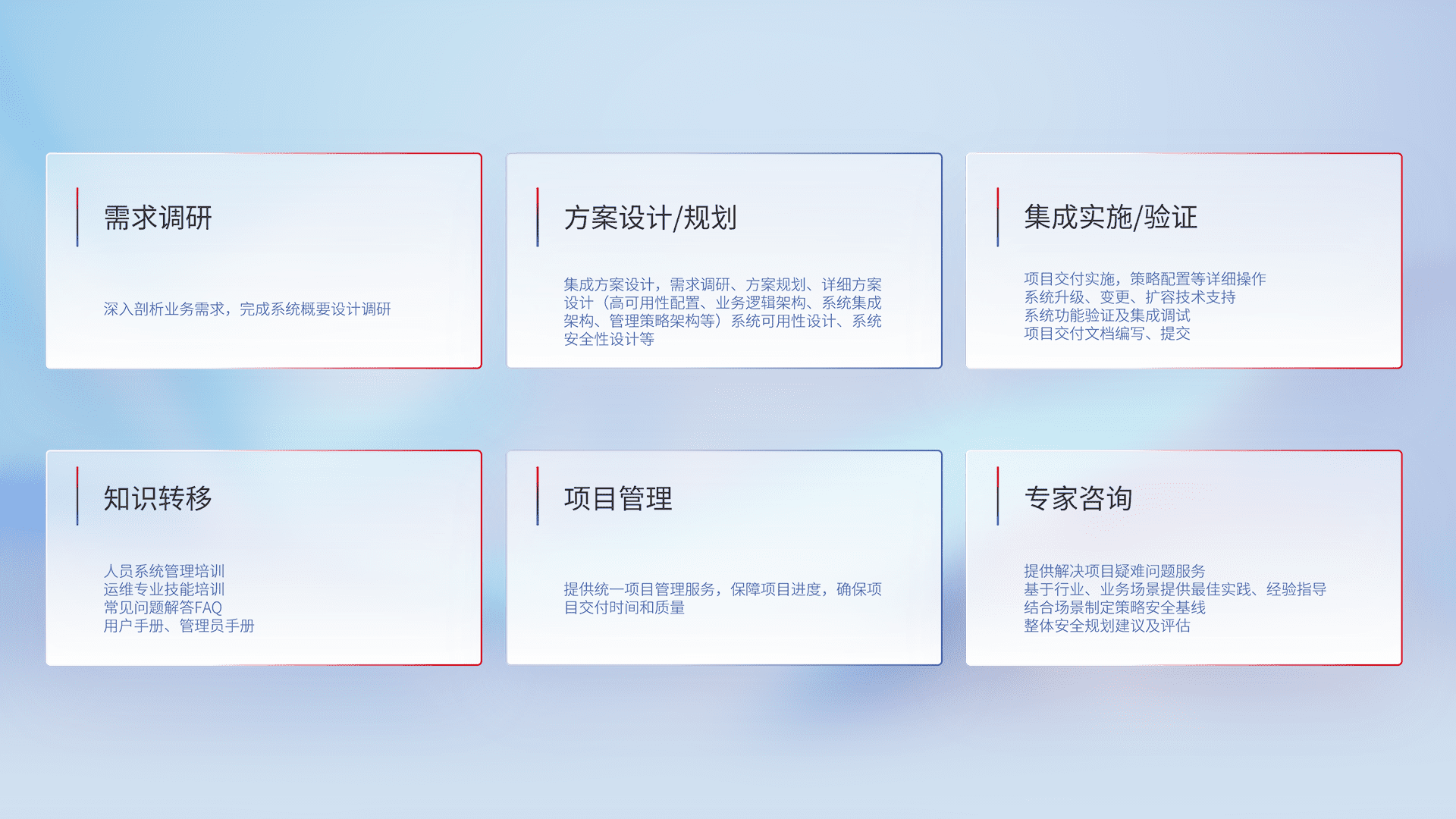 针对客户行业特性,,,,将宏观的安全战略和需求,,,通过专业的交付服务,,,实现项目落地,,,为客户提供标准规范的集成交付服务。。